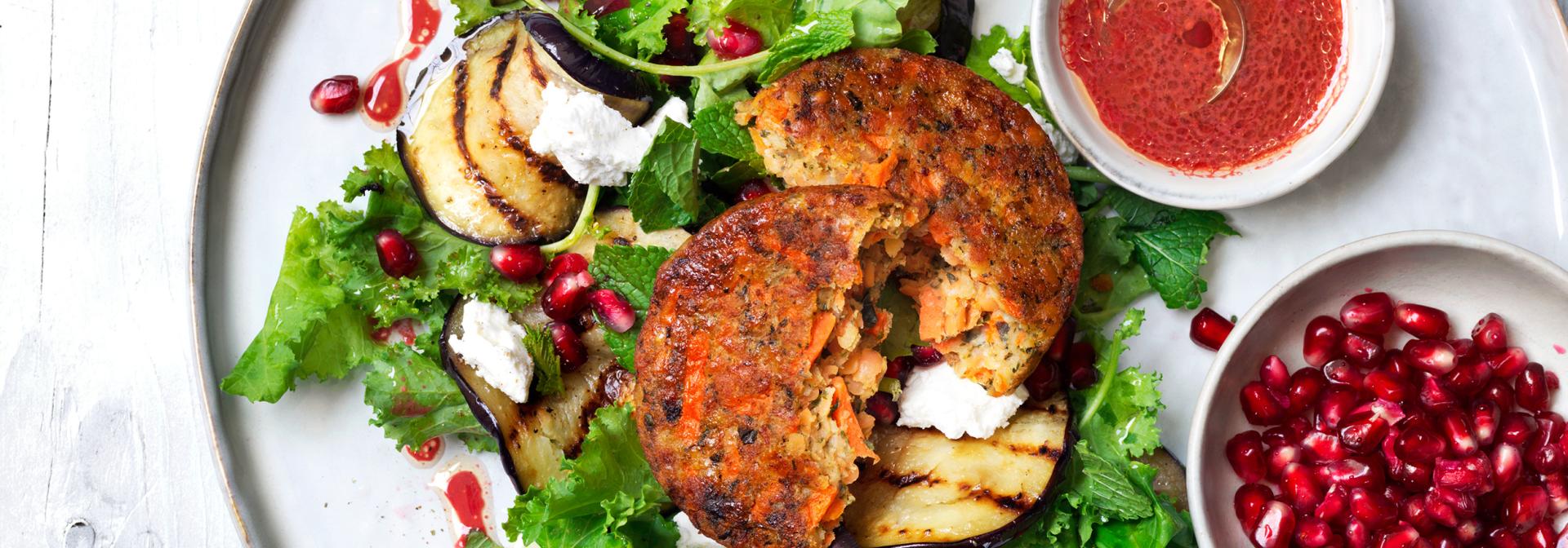 Aggiungi all'insalata e alle melanzane la menta tritata e i semi di melograno. Sbriciola sopra il formaggio di capra, se lo desideri. Servi l'insalata con i BurgerMINI Zucca.